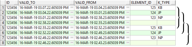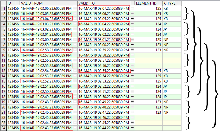 But only two versions, correspond to a real change. So the goal is to remove the non-real changes to each record and the values of „valid_from“ and „valid_to“ need not have a gap. The right „valid_from“ and „valid_to“ are marked in red.